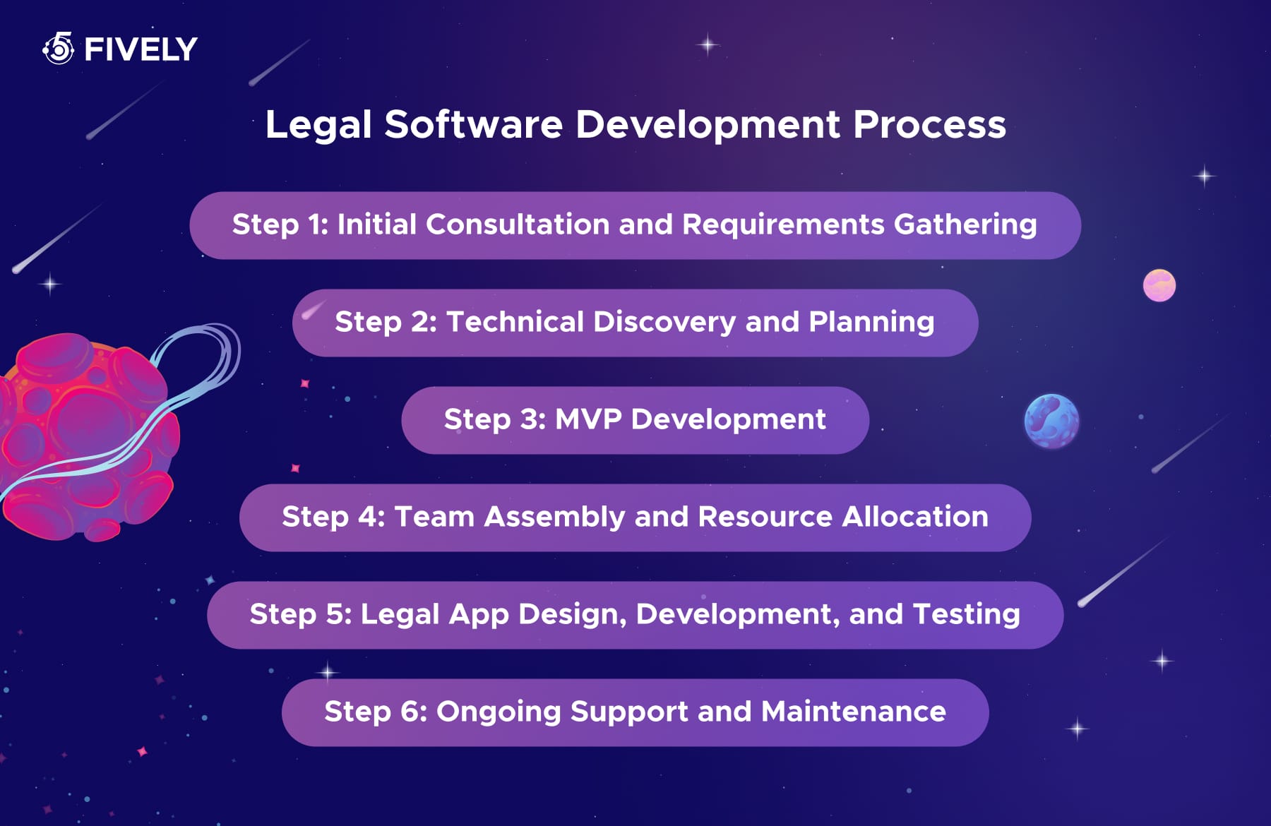 Building custom legal software requires a clear, structured, and transparent development flow — ensuring the final product meets every functional, security, and compliance requirement your firm relies on. At Fively, we follow a proven process that turns complex legal workflows into powerful, intuitive digital solutions.